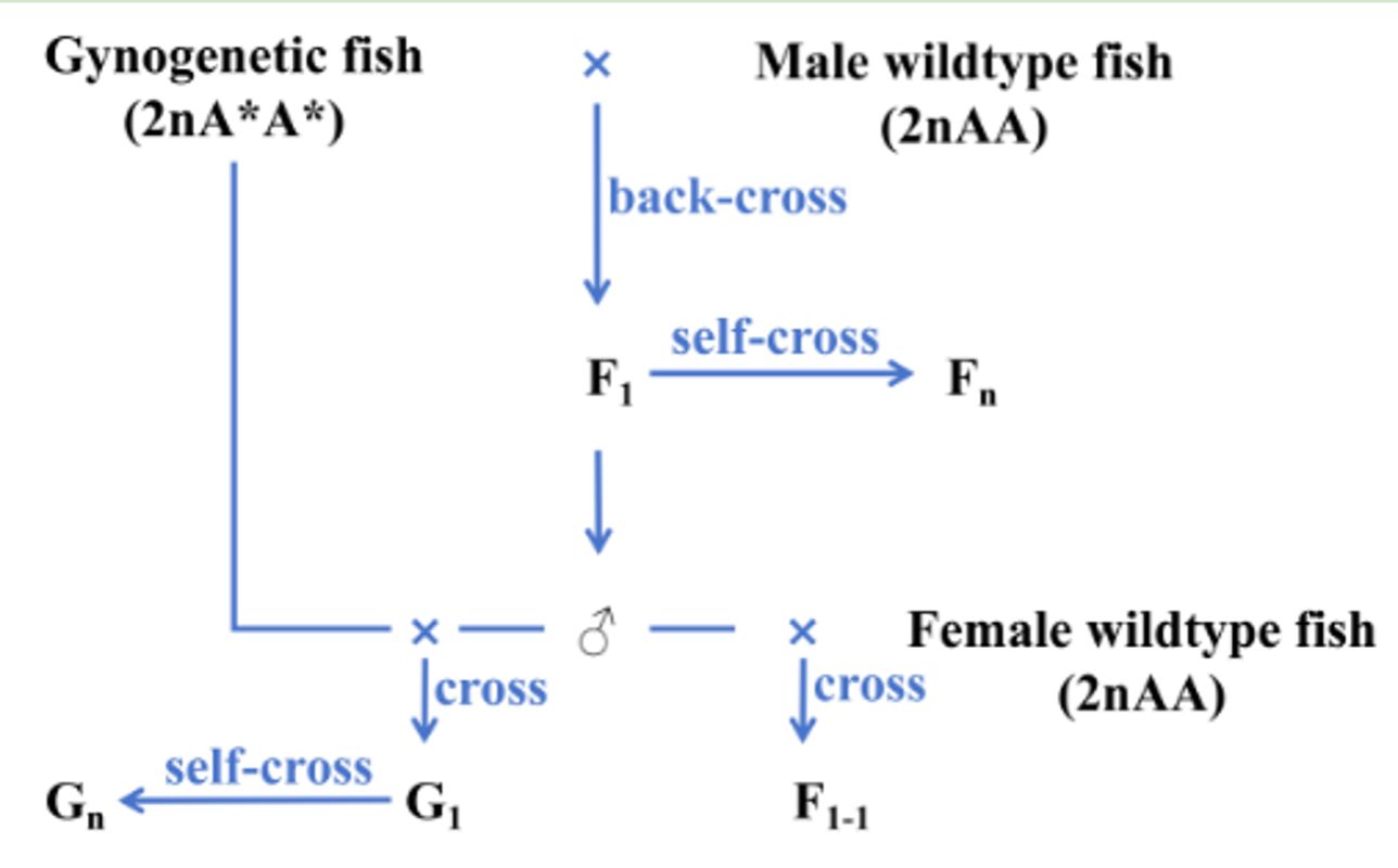 图6. 微杂交中的异精雌核发育育种策略图::该示意图展示了由雌核发育鱼(2nA*A*)与野生型鱼(2nAA)之间进行杂交、回交与自交的遗传改良流程。雌核发育鱼首先与野生型雄鱼进行回交产生F代,F₁代个体经过自交可逐代延续形成Fₙ群体。同时,F₁代还能作为父本或母本与野生型雌鱼交配,产生 F₁₋₁等后代群体;此外,雌核发育鱼与F₁后代之间也可进行交配,从而形成G₁,并进一步通过自交获得 Gn。整体流程体现了以雌核系为核心,通过回交、自交等方式形成雌核发育鱼品系。这种雌核发育鱼品系可能与野生品系存在遗传特性等方面的不同,这两个品系的交配有可能形成“杂交”优势。