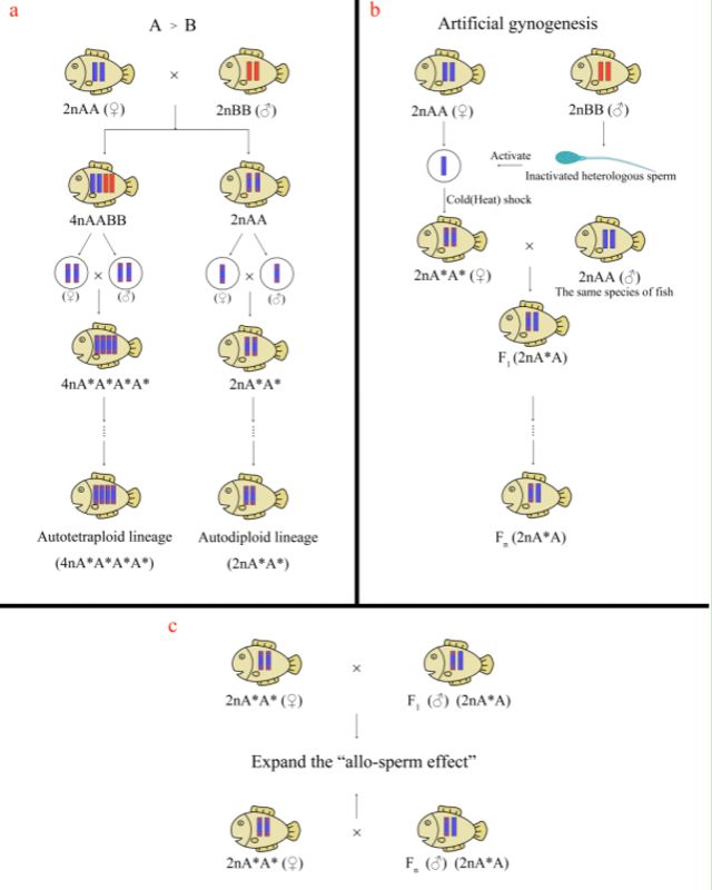 在微杂交的异精雌核发育育种途径中(图5b),精子来源于不同种的异源种类,其主要作用是激活卵子,而非完整地参与核基因组的形成。通过对精子进行遗传灭活处理,并通过冷休克或热休克制卵子的第二极体排出,可获得异精雌核发育二倍体后代。如果母本的性别决定类型属于同配(XX)型,其异精雌核发育后代通常表现为全雌性(XX型),这些后代的基因组来源于母本,但插入了父本的DNA片段,体现出微杂交效应。这种效应不仅具有可遗传性,还可通过相应的扩繁育种技术路线(图5c)在随后的世代中被进一步巩固和放大。