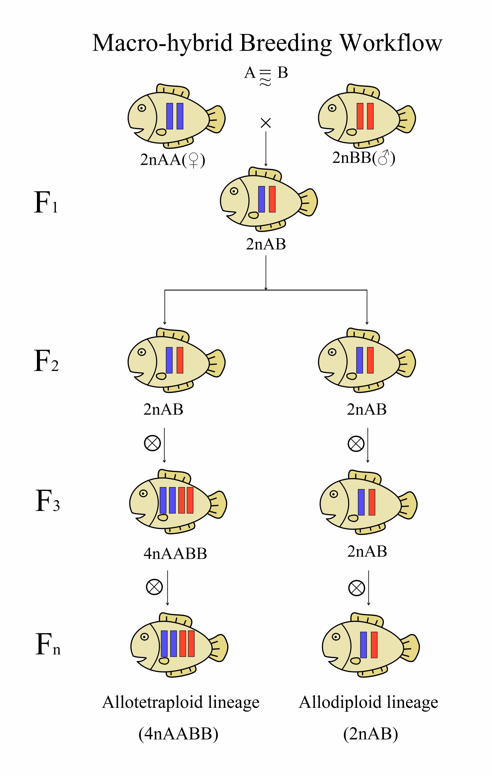 基于鱼类大杂交和微杂交的理论和育种技术,构建了相应的辅助育种技术,包括亲本染色体与亚基因组鉴别、父本DNA片段检测、倍性与杂交类型鉴定、以及相关孵化体系。依托大杂交和微杂交的育种技术和相应的辅助育种技术,形成了一系列的优良鱼类,展示了良好的产业前景。