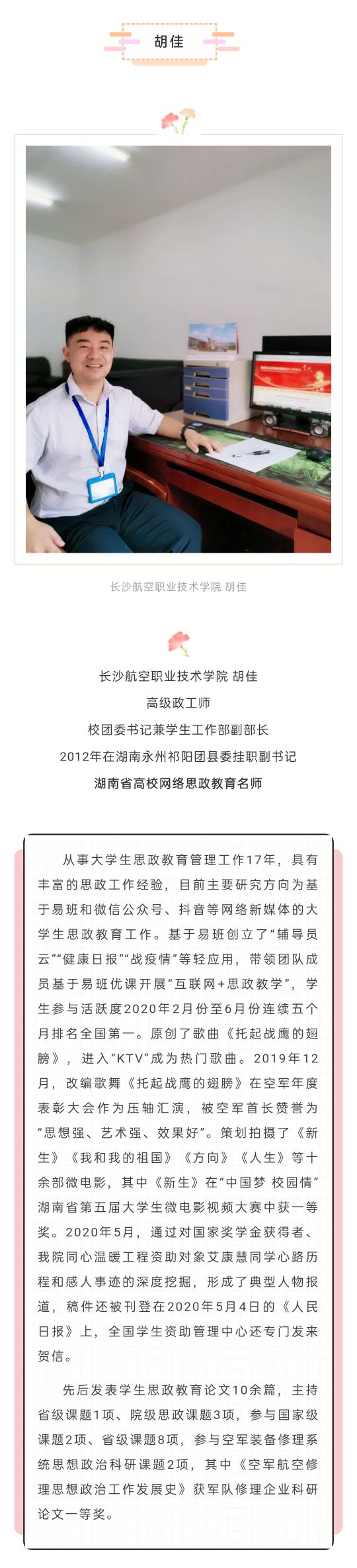胡佳:长沙航空职业技术学院校团委书记兼学生工作部副部长、高级政工师、第一批“湖南省高校网络教育名师培育支持计划”入选者