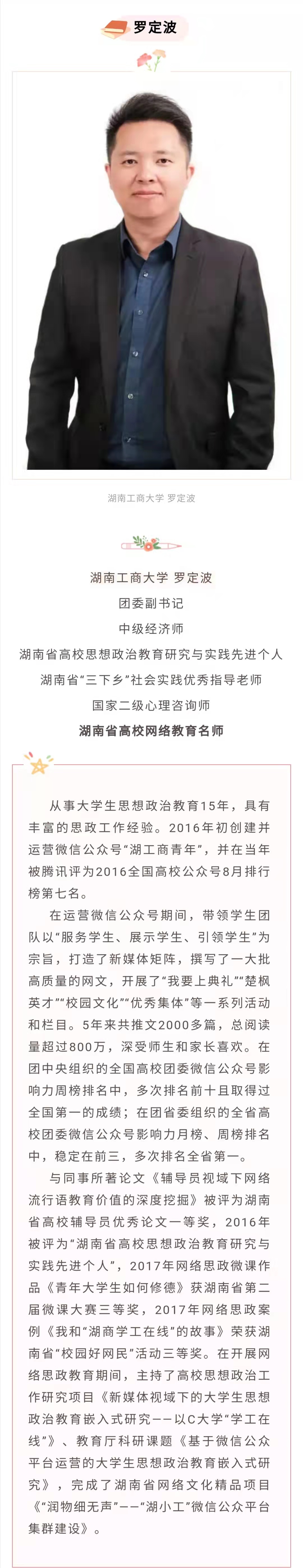 罗定波:湖南工商大学团委副书记、中级经济师、国家二级心理咨询师、第二批“湖南省高校网络教育名师培育支持计划”入选者