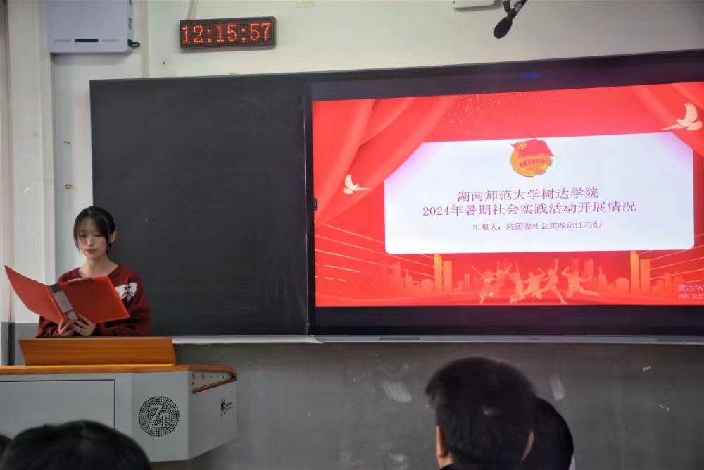 社会实践部部长江巧如对学院2024年暑期社会实践活动的开展情况进行汇报。