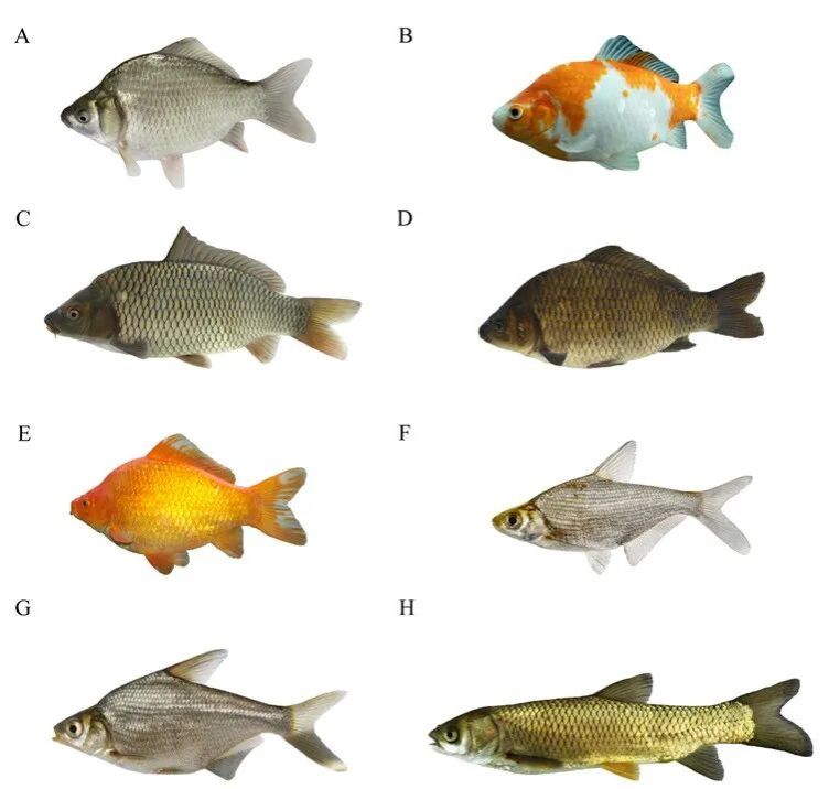 3. 微杂交中的远缘杂交育种途径培育的代表性优良鱼类: (A)湘军鲫 (B)湘军花鲫 (C)湘军鲤 (D)同源四倍体鲫 (E)天然雌核发育红鲫 (F)天然雌核发育团头鲂(黄尾密鲴) (G)天然雌核发育团头鲂(翘嘴鳜) (H)天然雌核发育草鱼