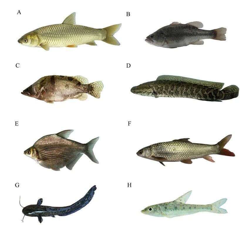 4. 微杂交中的异精雌核发育育种途径培育的代表性优良鱼类: (A)雌核发育草鱼 (B)雌核发育大口黑鲈 (C)雌核发育翘嘴鳜 (D)雌核发育乌鳢 (E)雌核发育团头鲂(锦鲤精子) (F)雌核发育鲮鱼 (G)雌核发育鲶鱼 (H)雌核发育花䱻