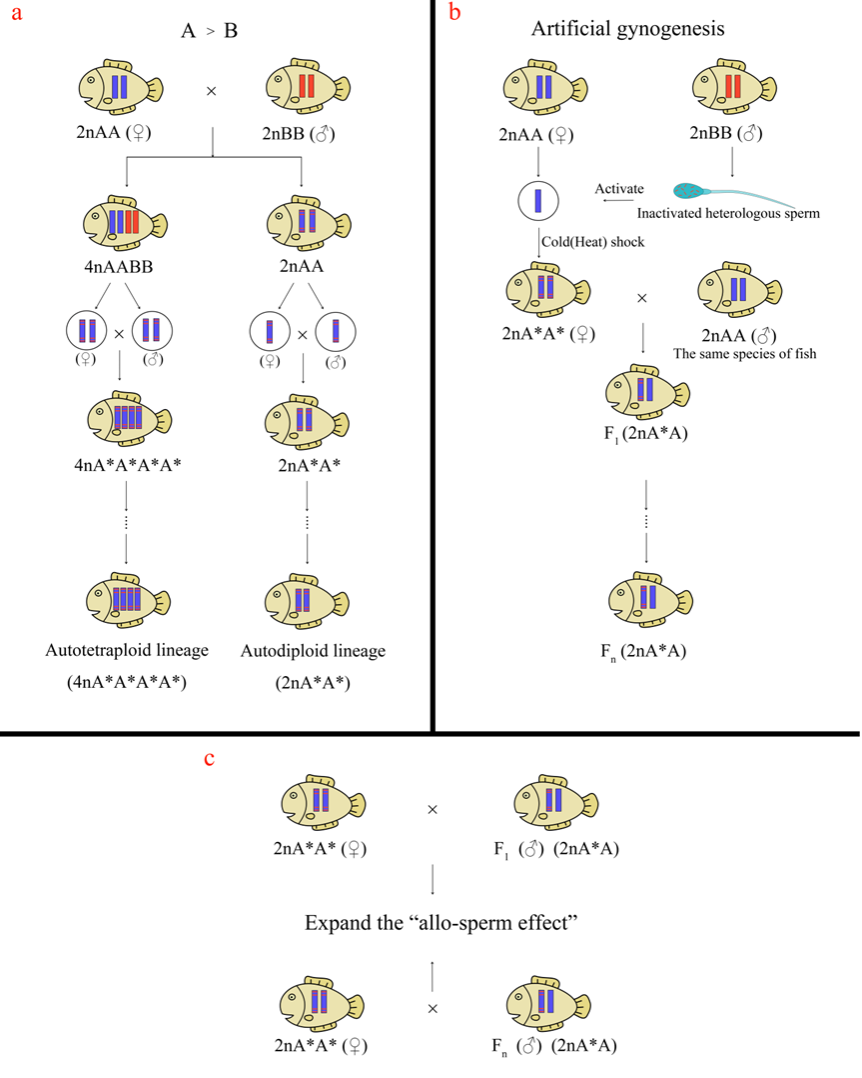 在微杂交的异精雌核发育育种途径中(图5b),精子来源于不同种的异源种类,其主要作用是激活卵子,而非完整地参与核基因组的形成。通过对精子进行遗传灭活处理,并通过冷休克或热休克制卵子的第二极体排出,可获得异精雌核发育二倍体后代。如果母本的性别决定类型属于同配(XX)型,其异精雌核发育后代通常表现为全雌性(XX型),这些后代的基因组来源于母本,但插入了父本的DNA片段,体现出微杂交效应。这种效应不仅具有可遗传性,还可通过相应的扩繁育种技术路线(图5c)在随后的世代中被进一步巩固和放大。