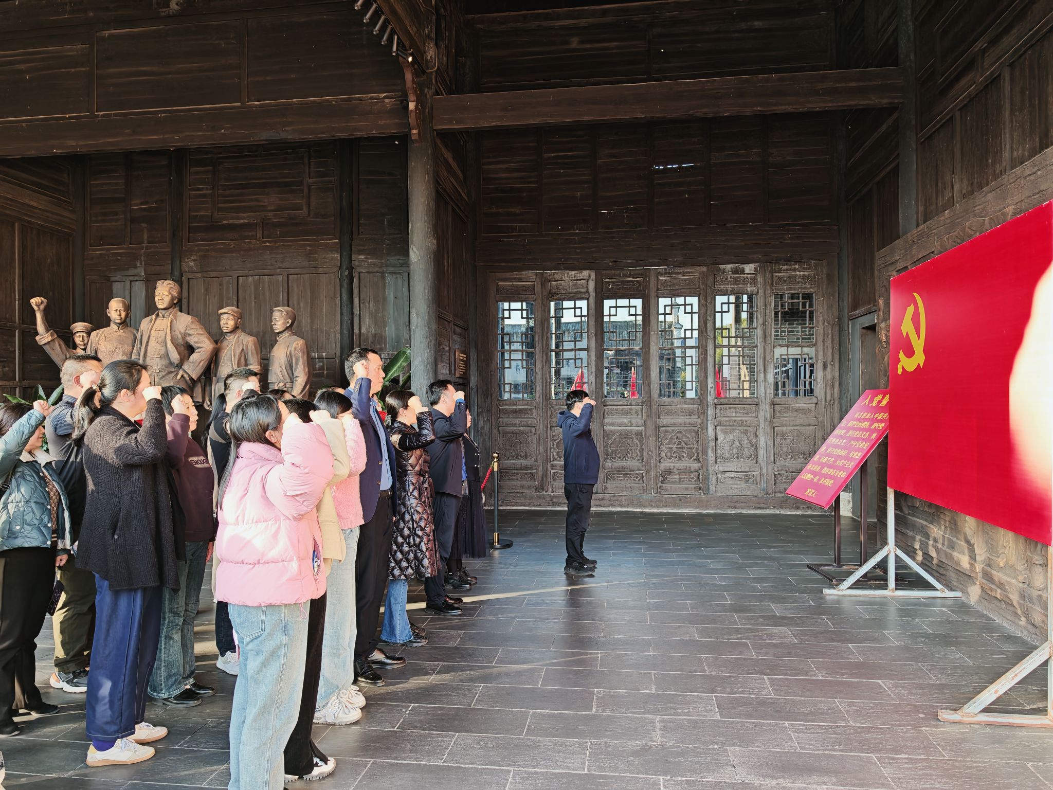 在茶陵县工农兵政府旧址正厅,全体党员,面对鲜红的党旗,重温入党誓词。馆内设有“毛泽东缔造的第一个红色政权——茶陵县工农兵政府历史陈列”,分为“潮起云涌,觉醒茶陵”“引兵井冈,首战茶陵”“建政茶陵,割据井冈”“红色政权,源自茶陵”“不忘初心,牢记使命”等5个部分13个展室,在讲解员的带领下,大家参观了纪念馆,追随革命先辈的历史足迹,缅怀革命先辈的丰功伟绩,领悟革命先辈的高尚品格。