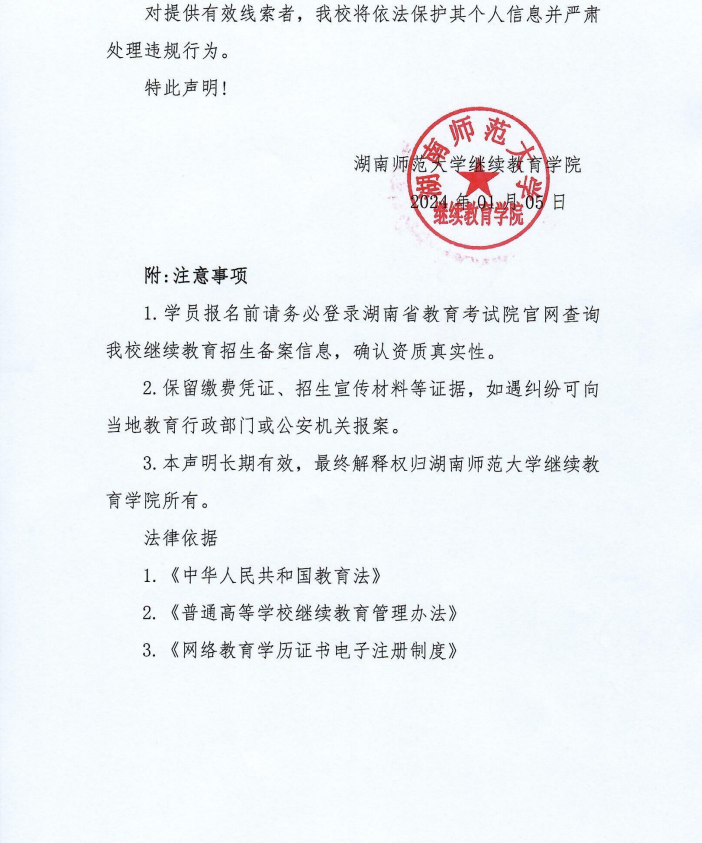 关于湖南师范大学高等学历继续教育招生的郑重声明