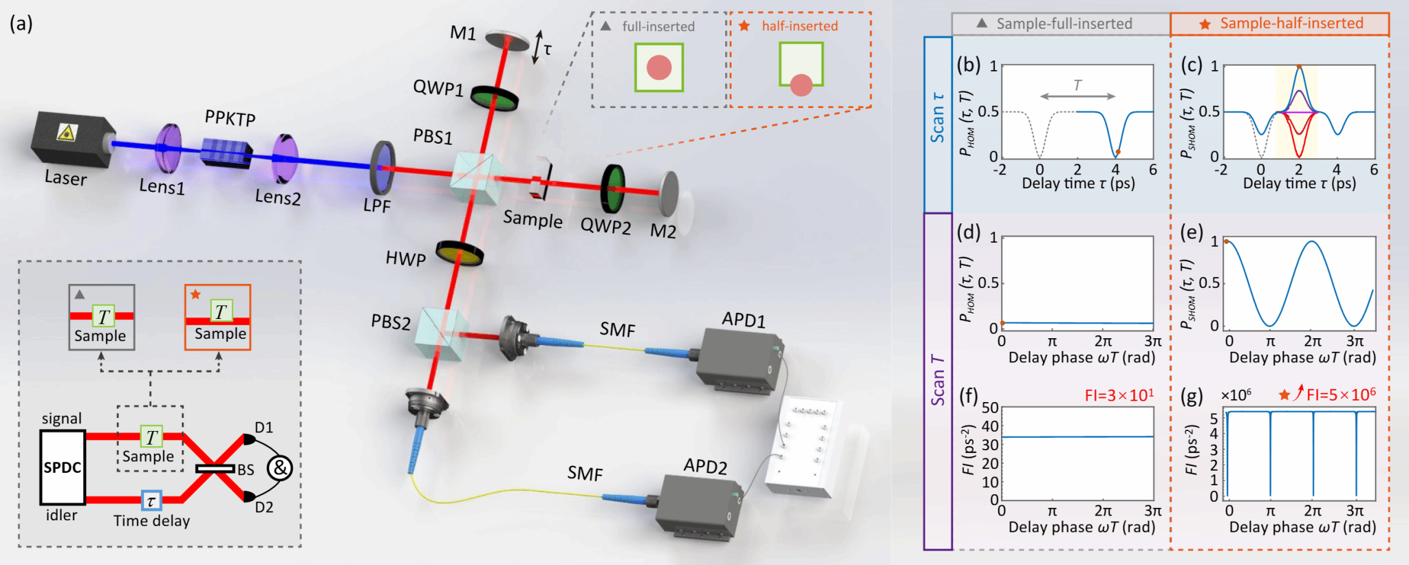 透明样品厚度测量是量子精密测量研究的重要课题。Hong-Ou-MandelHOM)干涉仪是量子光学中展示光子聚束效应的关键器件。传统的HOM干涉仪虽能实现纳米级厚度和阿秒级延迟时间的测量精度,但单次测量Fisher信息较小,需重复数万次才能达到阿秒精度,效率极低。